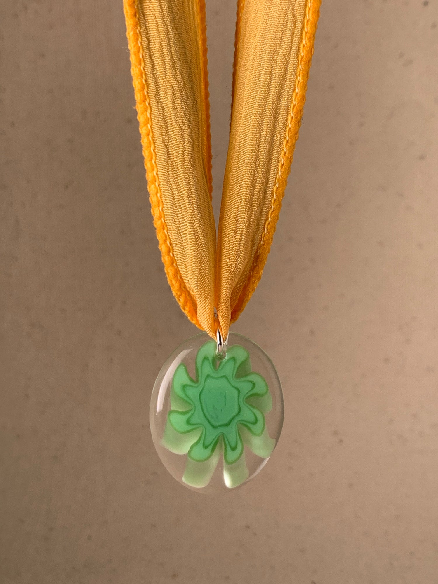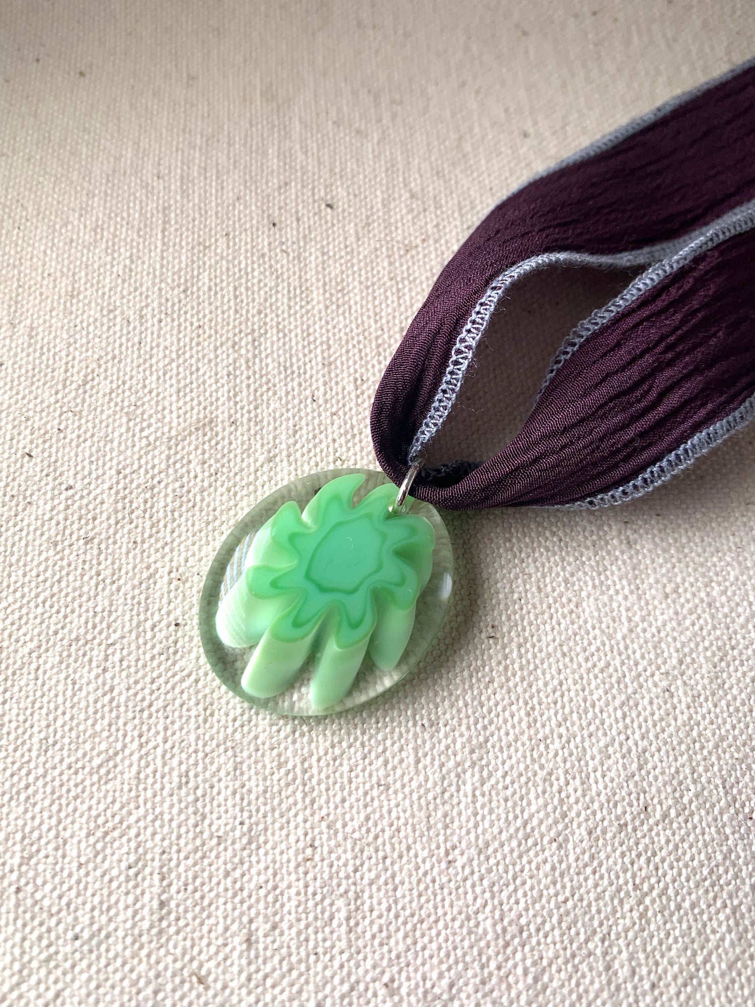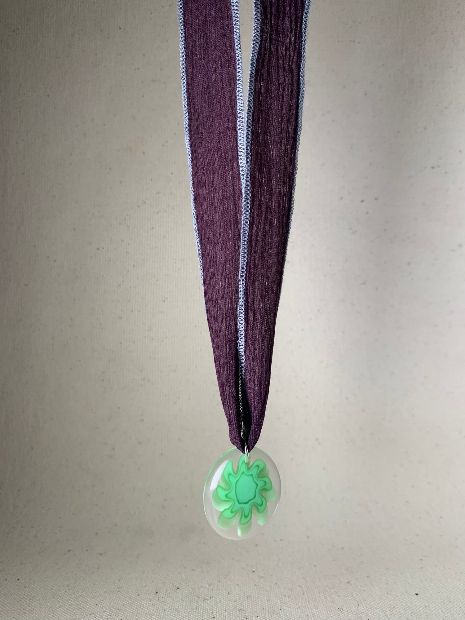 Featuring 1980s vintage German glass pendant with hand dyed silk ribbon. 38" in length