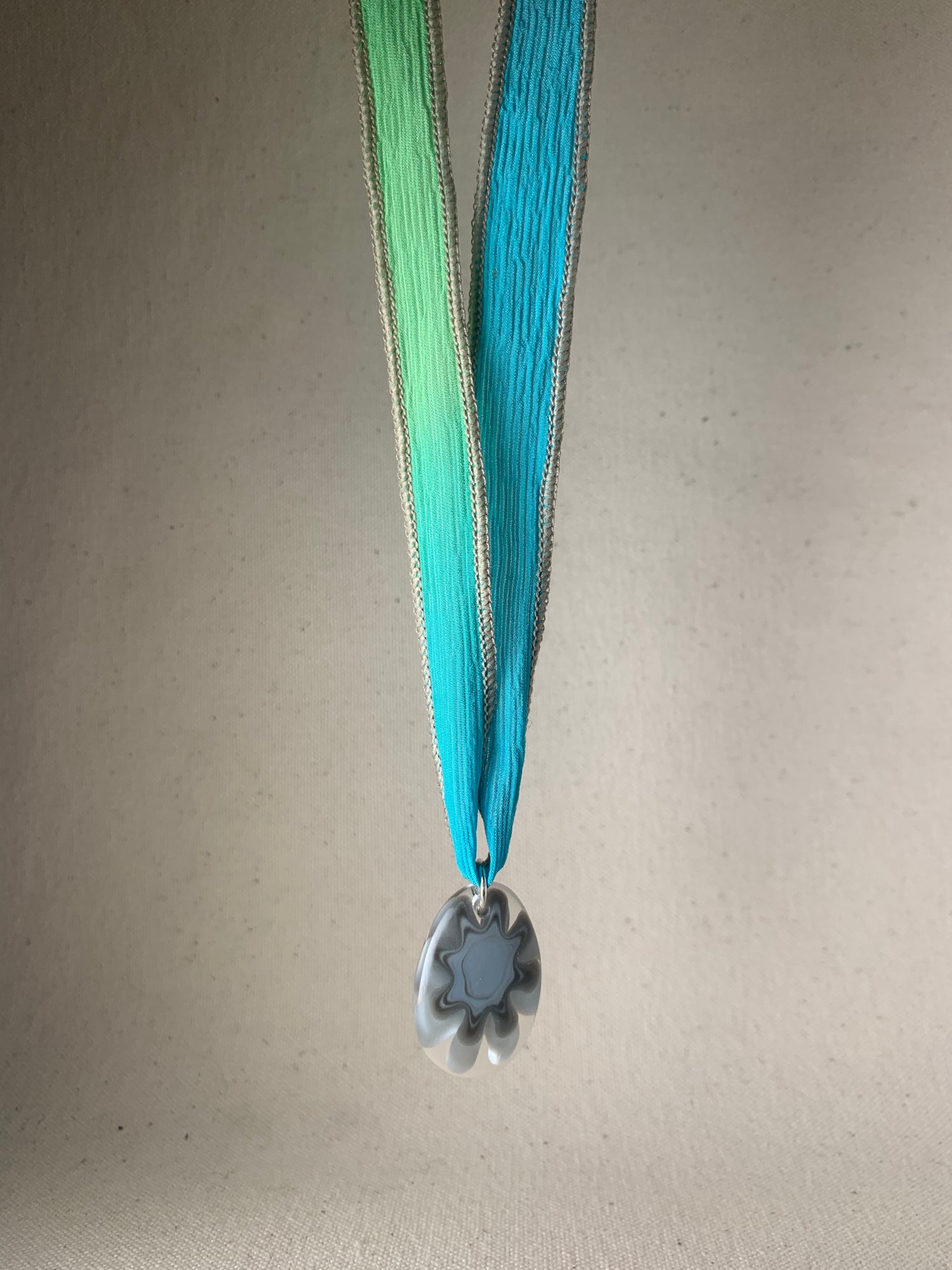 Featuring 1980s vintage German glass pendant with hand dyed silk ribbon. 38" in length