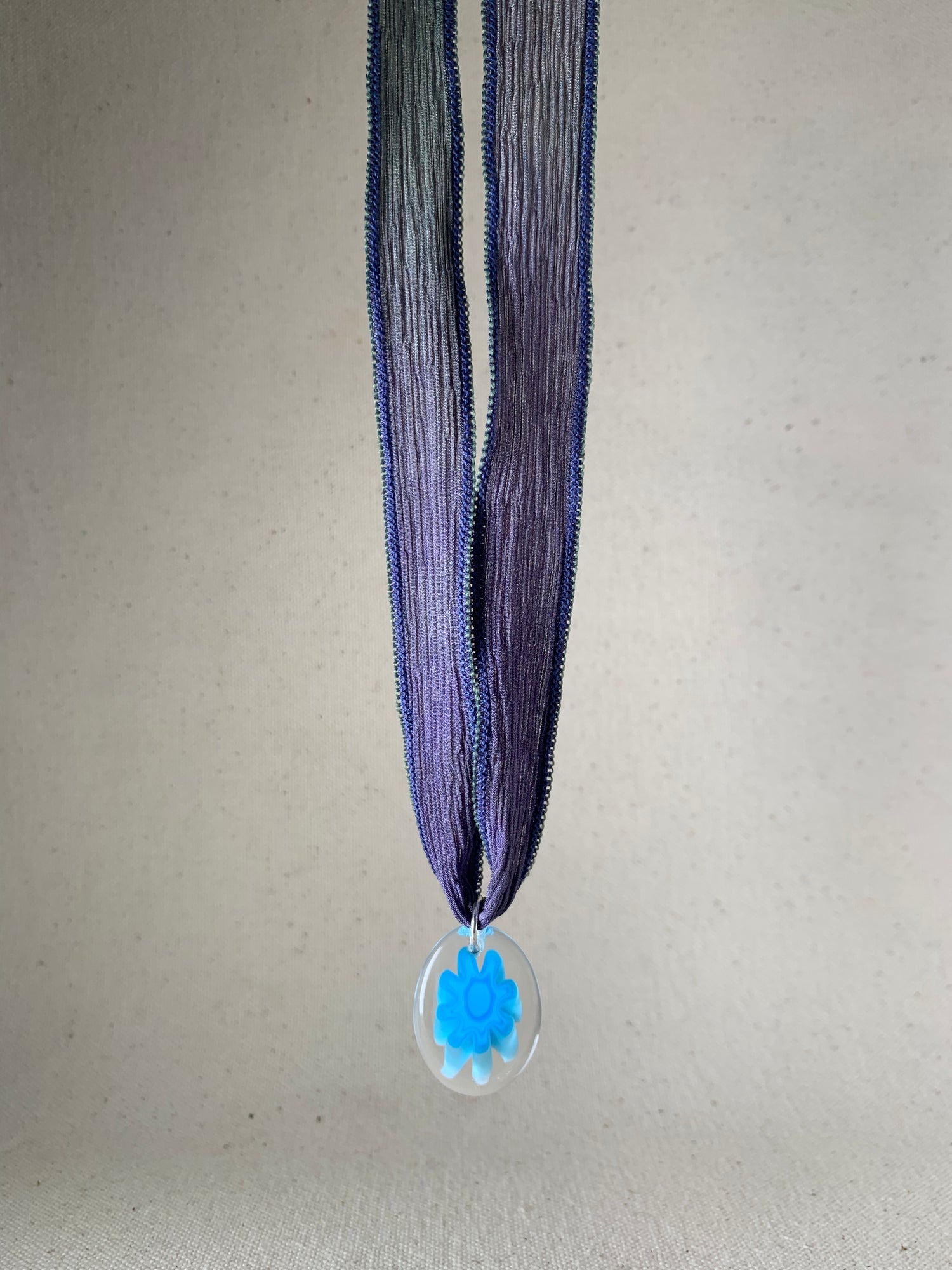 Featuring 1980s vintage German glass pendant with hand dyed silk ribbon. 38" in length