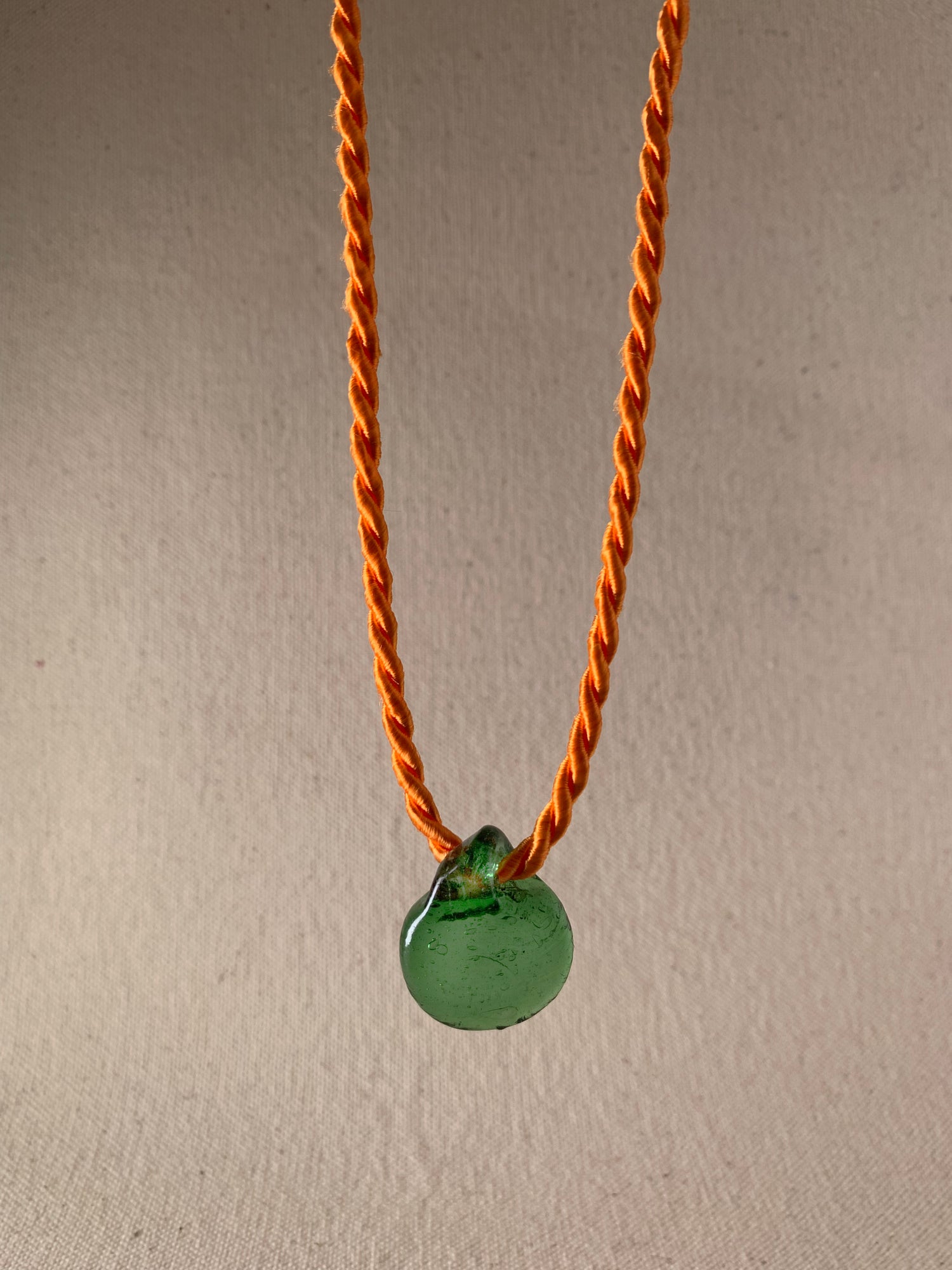 Featuring 1970s vintage artisan Indian glass, satin cord, and stainless steal slip ring. Adjustable 24"