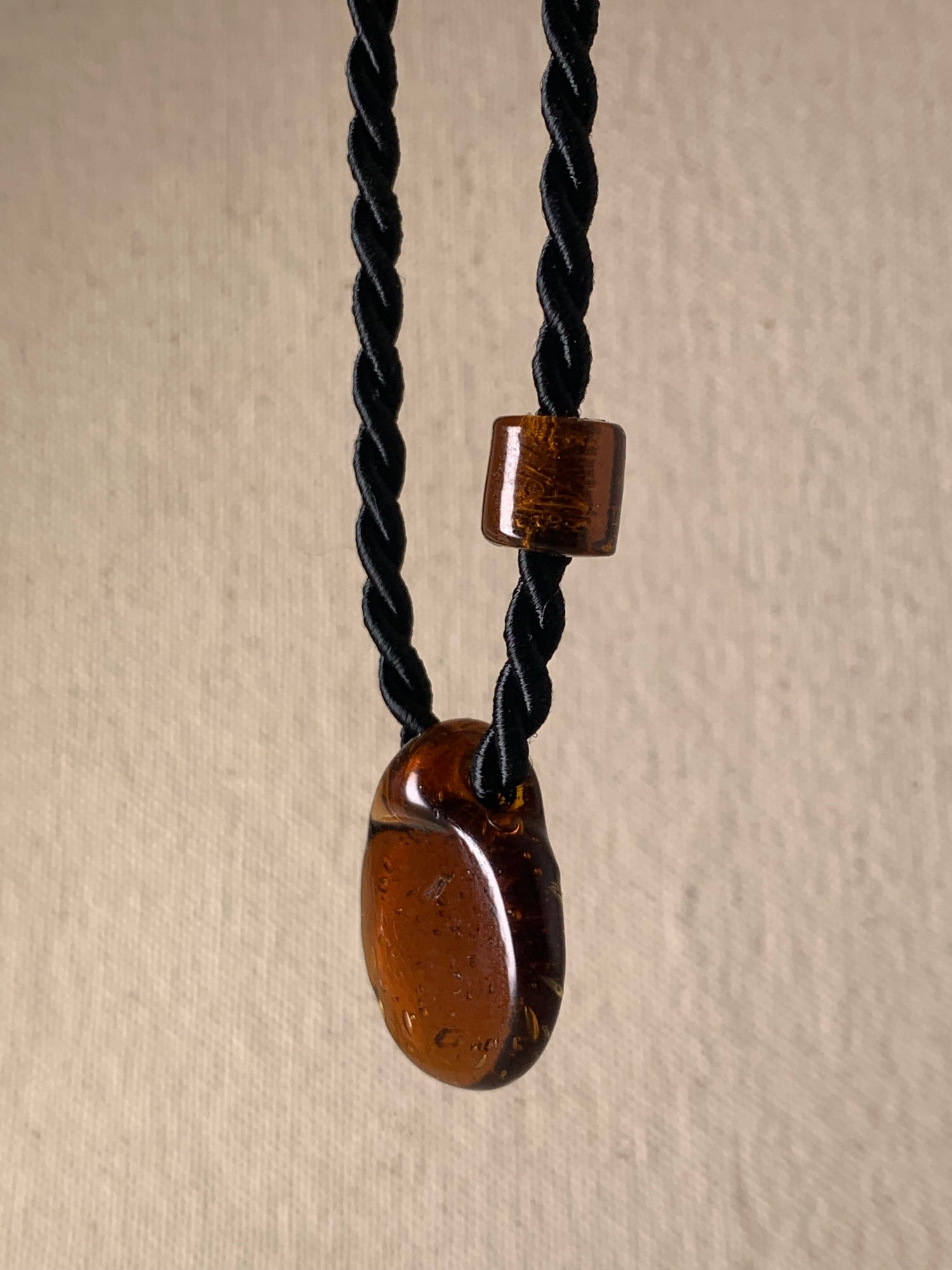 Featuring 1970s vintage artisan Indian glass, satin cord. Stainless steel slip ring or metal end ties. Comes in adjustable 24" or 38" waist belt/necklace