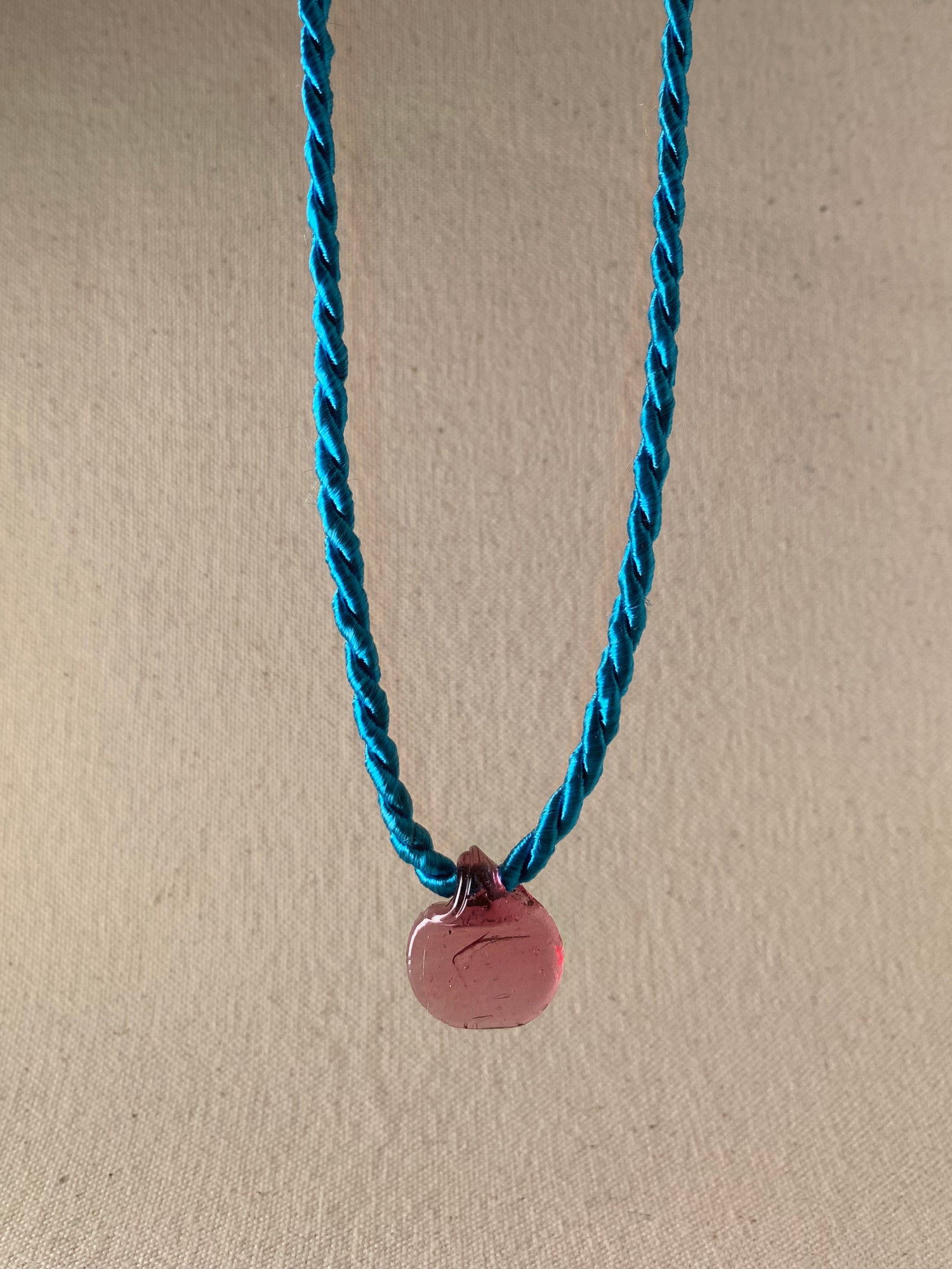 Featuring 1970s vintage artisan Indian glass, satin cord, and stainless steal slip ring. Adjustable 24"