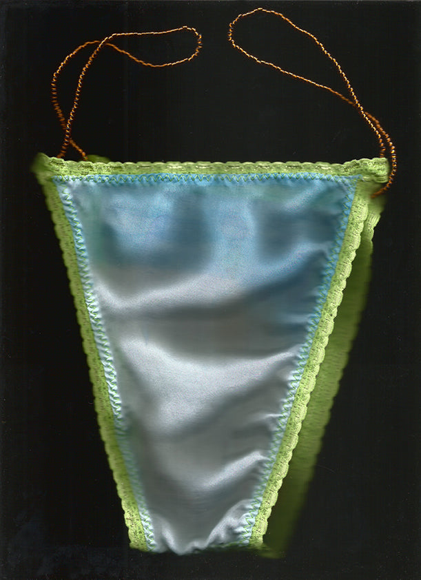 Chamber Sex Pot is a collaboration between Lana Nichols and Dominic Santos. All Pieces are composed of hand painted silk, glass beads, elastic, and lace trim. Each panty is crafted to be hung on the wall, or can be worn as a garment (gently).